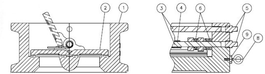 Check valve shall be of the double disc, wafer style with torsion spring induced closure. Valve shall be Wafer style for bolting between ANSI Class 125 flanges. Valves have a Cast Iron body (ASTM A-126, CL. B) to fit inside 125# ANSI bolt circles, a two piece Bronze disc (ASTM B-62, 85-5-5-5), type 316 Stainless Steel dual shafts, type 316 Stainless Steel torsion spring and have an integrally molded elastomer seat vulcanized to the body. Valve for horizontal flow shall be installed with the shafts in vertical position.